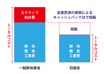 リサイクル専門商社の強みを活かし、旧設備・廃棄金属の買取と解体・撤去工事を一括で提供。相殺方式により、一般解体業者よりも大幅なコスト削減を実現します。